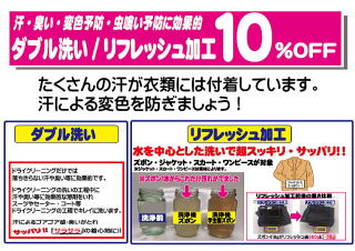 冬の汗はニオイがきつくなる場合があります。通常のドライクリーニングだけでは落ちない汗やニオイに効果的なダブル洗い・リフレッシュ加工はいかがですか?