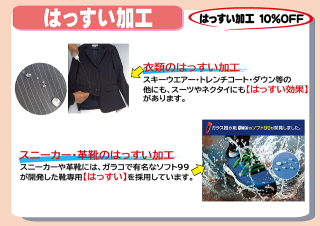 スニーカーや革靴等には、ガラコで有名なソフト99が開発した靴専用【はっすい】を採用しています。